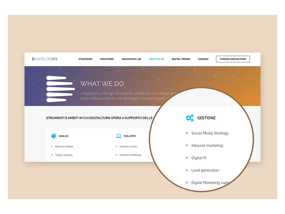 Definizione dell’architettura del sito, progettazione interfaccia grafica, creazione contenuti visivi, montaggio.
